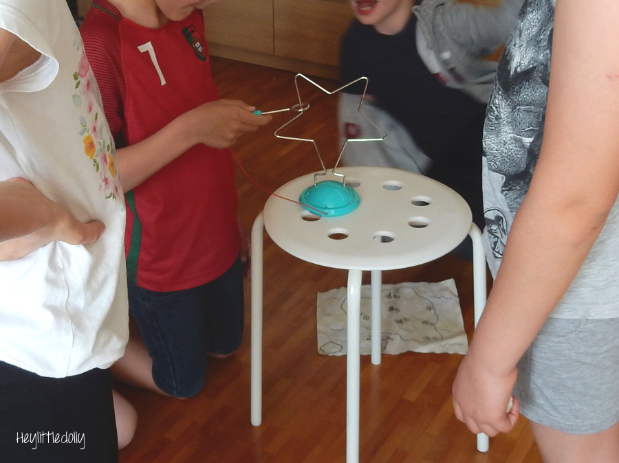 Pour élaborer mes questions, je me suis promenée dans mon appartement en cherchant des choses à compter. J’ai noté les questions et réponses sur une feuille. Puis, j’ai inscrit les questions sur des petits bouts de papier que j’ai mis dans une enveloppe. Derrière chaque enveloppe, j’ajoutais un indice pour les aider à trouver l’emplacement de la prochaine question. Parallèlement, j’ai moi-même confectionné une carte au trésor à l’image de l’appartement. J’y ai inscrit les différents indices pour les aider à se repérer. A mon avis, il y a moyen d’adapter les questions au maximum, que ce soit au niveau de la difficulté ou du thème. Et finalement, lors du dernier indice, les enfants étaient informés qu’ils devaient encore relever un défi avant de trouver le trésor ! Pour cette occasion, j’ai déniché un petit jeu de concentration et d’habileté… Le but de ce machin (vous le connaissez sûrement déjà), c’est de passer le petit crochet autour de l’un cercle de métal sans la toucher. Sinon, ça fait du bruit. Là aussi, on peut compter qui touche le plus souvent, ou bien juste les laisser participer pour le plaisir !